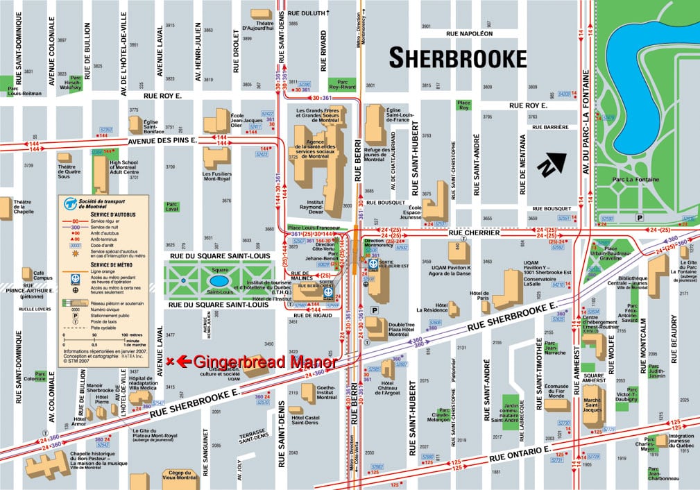 - Public Transport – Take bus 715 – Vieux Montréal in the direction of Berri-UQAM, remembering to ask for a transfer. Exit at the Berri-UQAM metro station. Take the orange line in the direction of Montmorency one stop until Sherbrooke. Exit the metro station toward St-Denis keeping right. Follow de Rigaud across St-Denis to Square St. Louis following the park to the end and then turn left. The house is half way up the street. Alternatively – You can walk to the Place d’Armes metro station by walking east on de la Commune and turning left on to St-Sulpice which becomes St-Urbain. Take the metro in the direction of Montmorency to the Sherbrooke stop. Exit the metro station toward St-Denis keeping right. Follow de Rigaud across St-Denis to Square St. Louis following the park to the end and then turn left. The house is half way up the street.